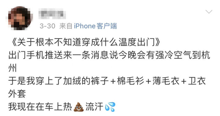 你今天出门穿够衣服了吗?这两天有网友在说根本不知道穿成什么温度出门,一下冷一下热: