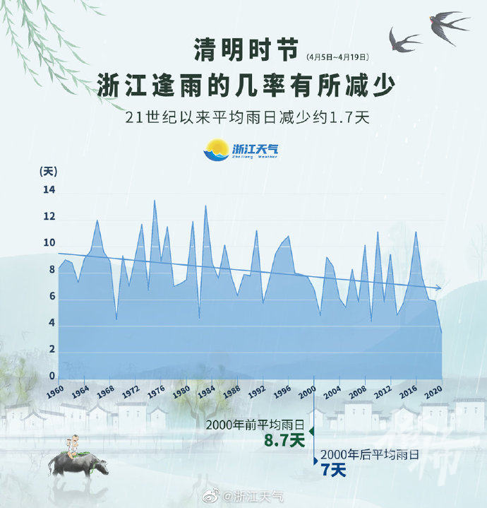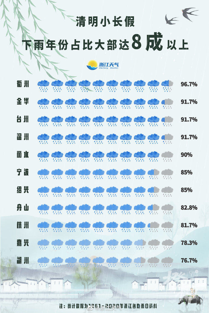 据浙江天气统计,清明小长假浙江下雨的年份占比大部达8成以上,而今年的清明小长假不再是雨纷纷,另外21世纪以来浙江逢雨的几率有所减少。
