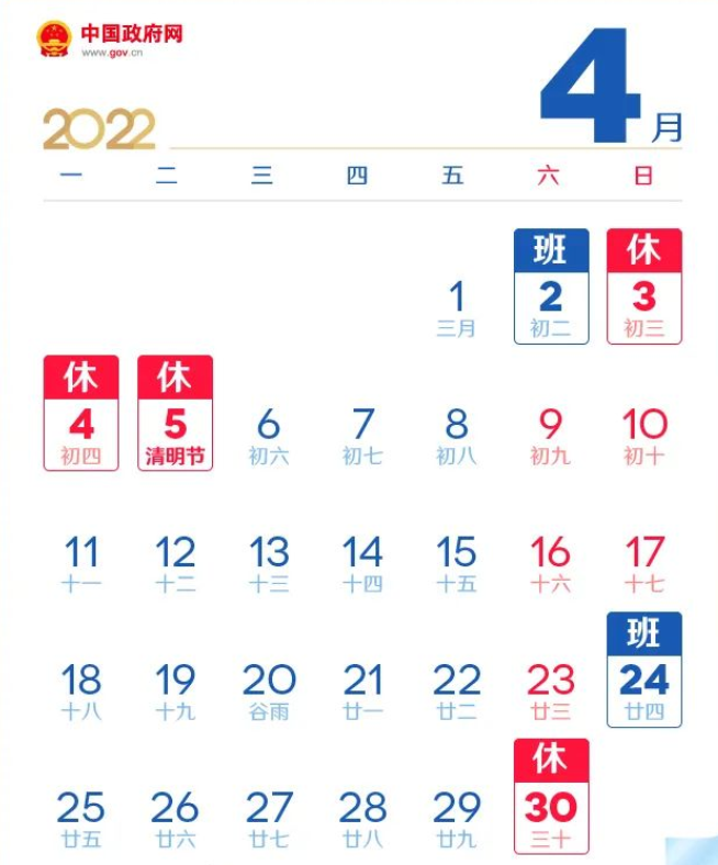 都市快报报道 据中国政府网,2022年清明节放假安排如下:4月3日(星期日) 至5日(星期二)放假调休, 共3天,4月2日(星期六)上班。