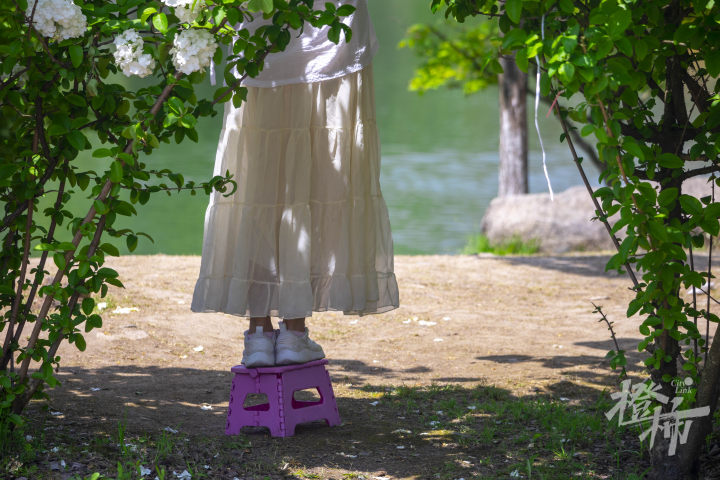 因为木绣球较高,所以有经验的游客,会带上小椅子,站在上面,可以更好地和木绣球合影。