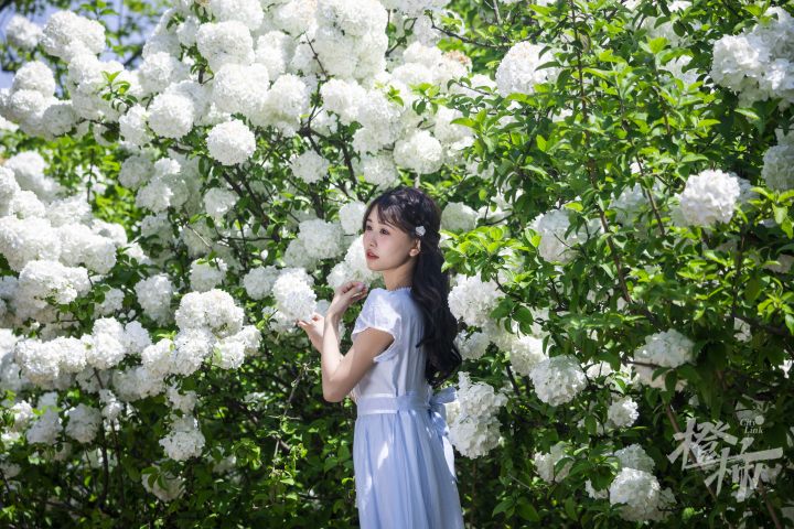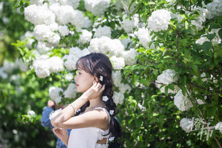 长长的几百米路上,远远就能看到,一团一团的白色木绣球花,就像云朵一样,挂在枝头。就连停车场,也被着团团白色包围着。