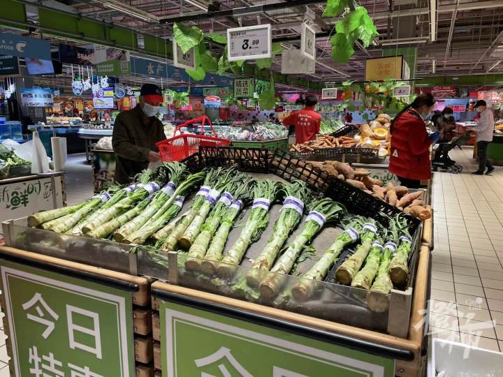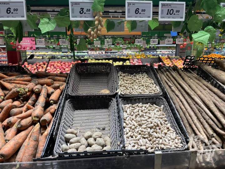 一位正在上架新鲜红薯的工作人员表示,这两天,蔬菜的供应还是可以的,可能个别单品会缺,“像是今天土豆就没来。”