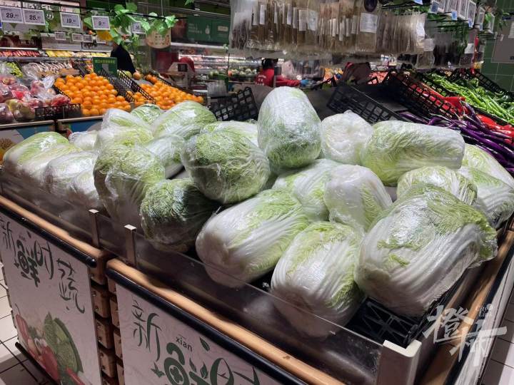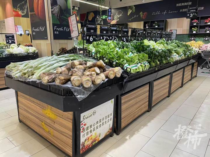 赶到这家超市时,橙柿互动记者看到,蔬菜瓜果肉类供应充足,只有两个盛装土豆的编织框里,所剩不多。