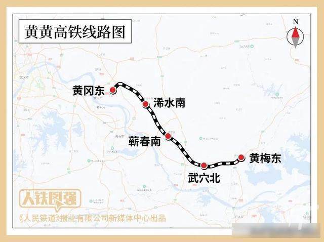 连接湖北黄冈和黄梅两地的黄黄高铁由黄冈东站至黄梅东站,全长约125公里,中途设浠水南站、蕲春南站、武穴北站,设计速度350公里/小时。