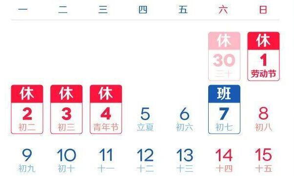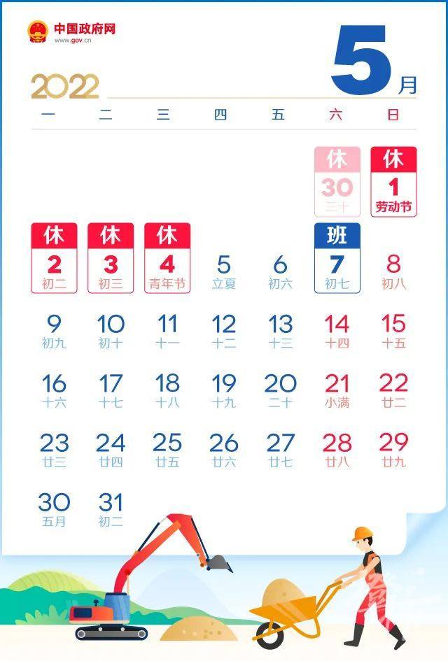 根据《国务院办公厅关于2022年部分节假日安排的通知》,2022五一放假为:4月30日至5月4日,放假调休共5天。4月24日(星期日)、5月7日(星期六)为正常工作日。