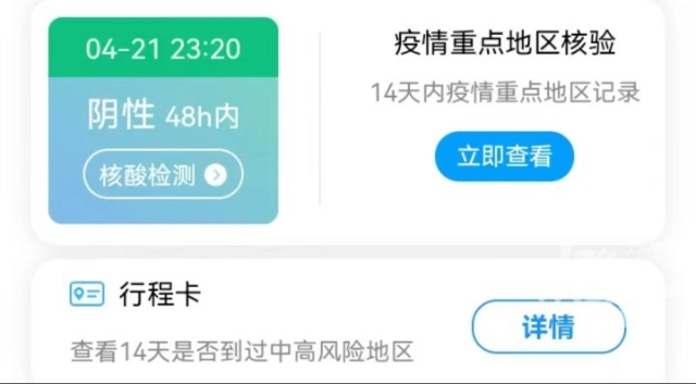 新增加两项功能中,核酸检测信息除了显示“阴性”或“阳性”信息外,还能显示最近一次核酸检测的时间;疫情重点地区核验信息则会显示“去过”“未去过”和“未查询到”三类结果。