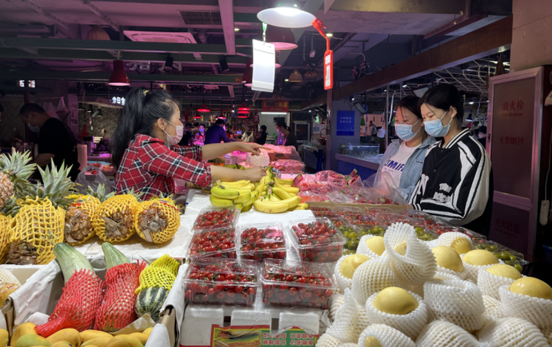 4月24日,在古运路小河农贸市场,居民需要佩戴口罩、测温、扫行程码、查验健康码和核酸检测结果之后,才能进入菜场购物。目前,菜场里水果、蔬菜、蛋禽、肉、米等生活物资供应充足。