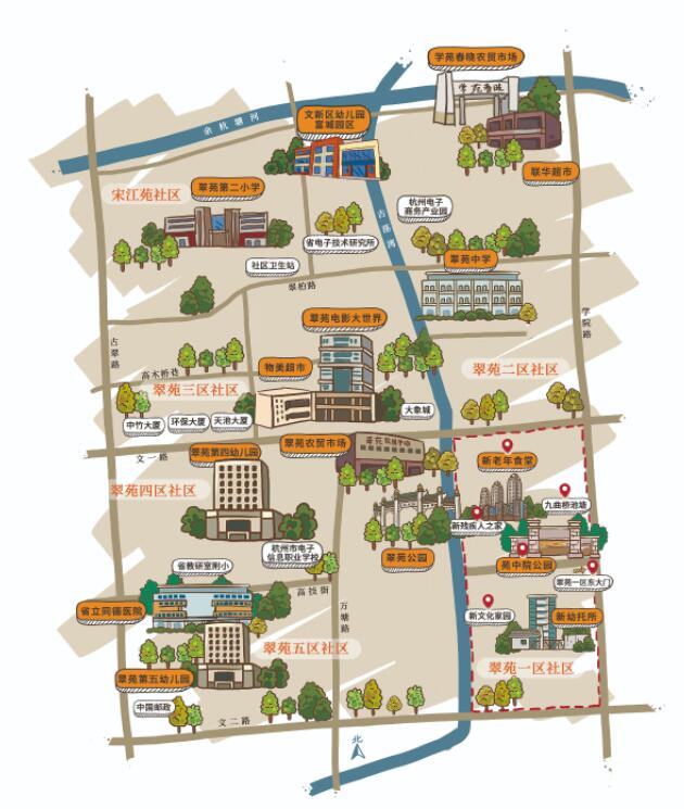 翠苑一区未来社区实施单元地处西湖区核心区块,东至学院路,南至文二路,北至文一路,西至古翠路,总面积约0.21平方公里。