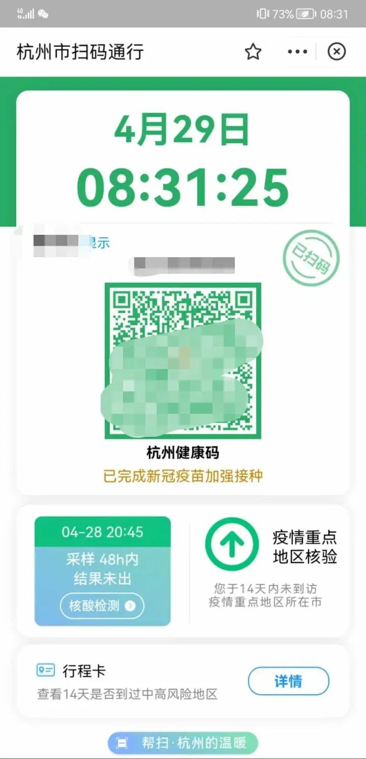 今天早上不少市民坐地铁时,扫场所码发下杭州健康码升级了,健康码“四码一屏”下面显示核酸采样的时间了。