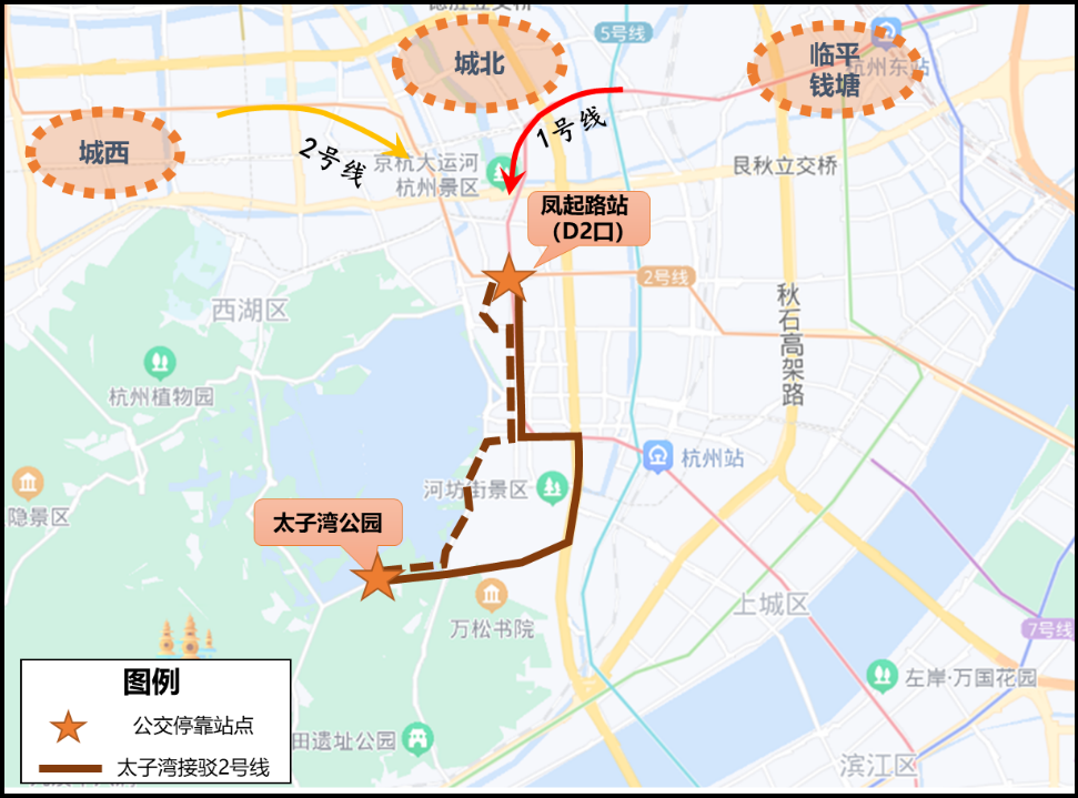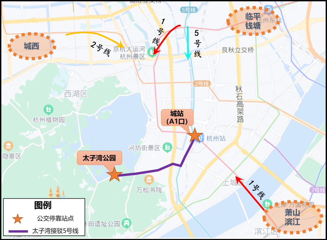 3、地铁城站站(太子湾接驳1号线、5号线)。地铁1号线、5号线城站站A1出口城站火车站公交站始发,经江城路至雄镇楼环岛折返后,再经江城路、上仓桥路、严官巷、万松岭隧道、美术馆街、南山路至苏堤停车场;回程循原线至城站火车站。