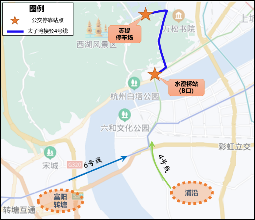 2、地铁水澄桥站(太子湾接驳4号线)。地铁4号线水澄桥B口始发,经安民街、水澄北路、虎玉路、南复路、玉皇山路、南山路至苏堤停车场;回程循原线至水澄桥站。