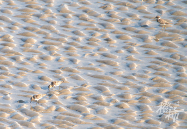 它们常三两成群,一边享受着阳光,一边在滩涂上觅食。
