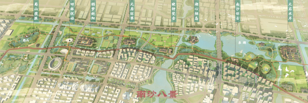 “一带”为南沙大堤生态人文带,承续南沙围垦文化脉络,呼应数字化改革植入元宇宙科技,塑造具有市域感召力的南沙元启园,布局“南沙人文八景”,并塑造南沙文道承续大堤文脉,串联3个主题景园。