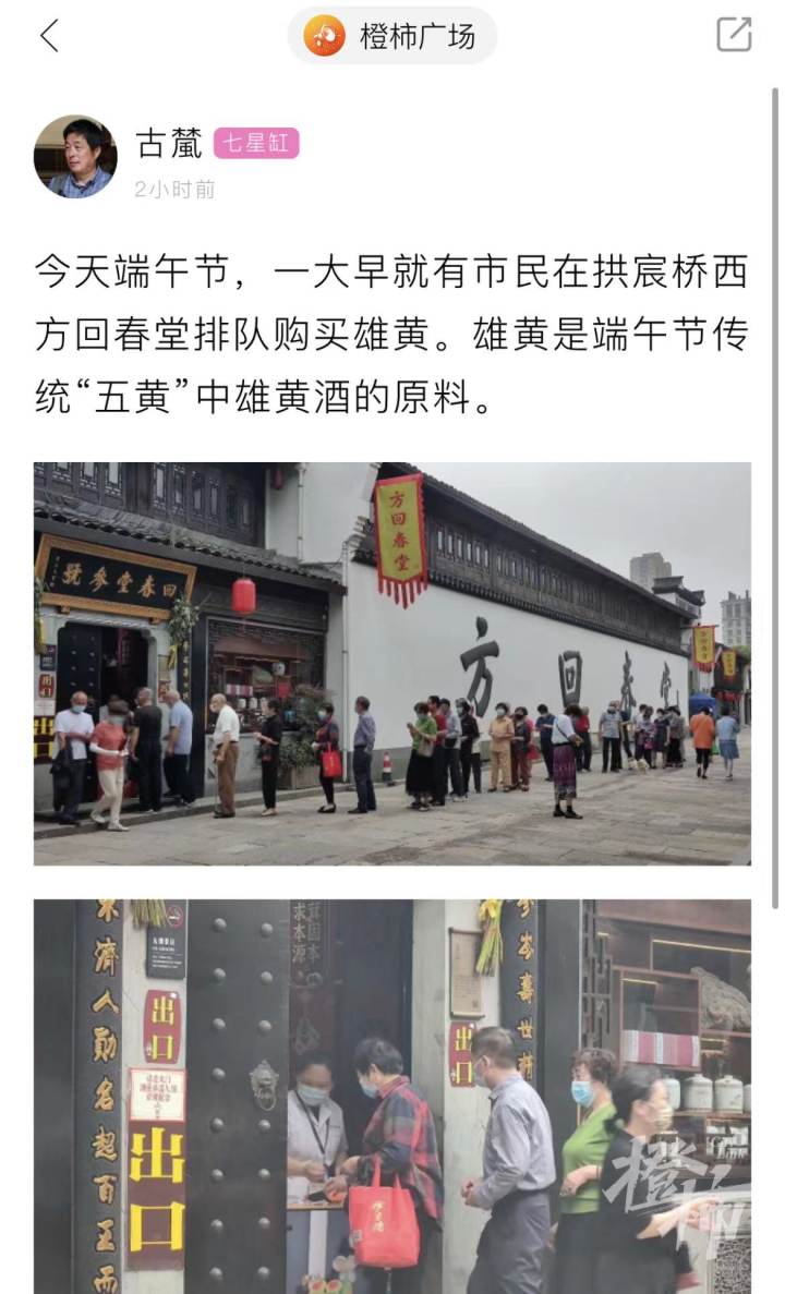 至于雄黄,今早橙友“古檒”爆料:今天端午节,一大早就有市民在拱宸桥西方回春堂排队购买雄黄。雄黄是端午节传统“五黄”中雄黄酒的原料。