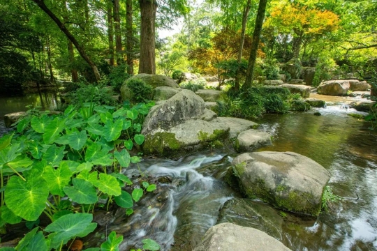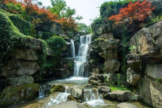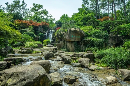 主山山势相对较高,“花信瀑”从山顶一泻而下落入“花盟潭”,顺山势而下,形成“山花溪”,溪中大小不等的岩石使水流或缓或急。置身其中,仿佛融入自然的真山秀水中,是不是有点像mini版的黄果树瀑布?