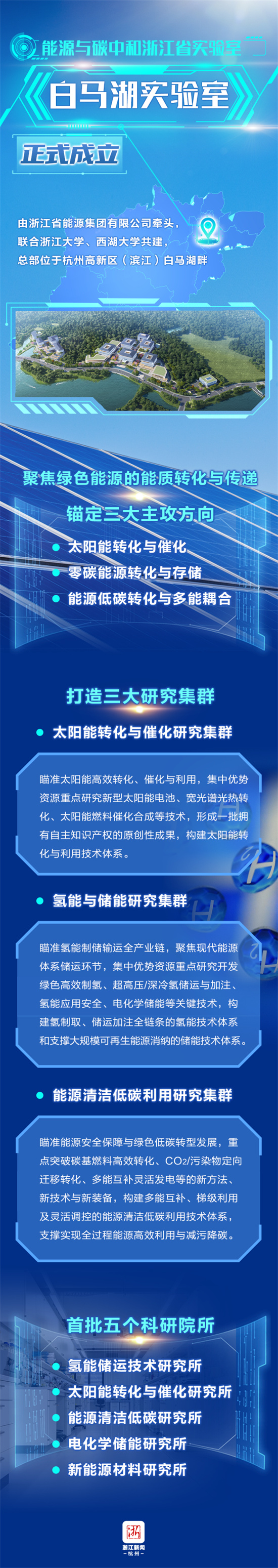 白马湖实验室由浙江省能源集团牵头,联合浙江大学、西湖大学共建,地方政府及国资国企支持,民资民企参与,将瞄准世界能源科技发展前沿,立足浙江产业需求,对接国家重大战略,承接国家重大任务,“碳”寻能源之道,以能源领域科技创新厚植动能、制胜未来,聚焦绿色能源的能质转化与传递,围绕太阳能转化与催化、零碳能源转化与存储、能源低碳转化与多能耦合等方向开展研究,着力破解能源领域重大科学问题、突破关键技术,构建多元协同发展的清洁能源供应体系,推动产业绿色低碳转型,保障能源安全。