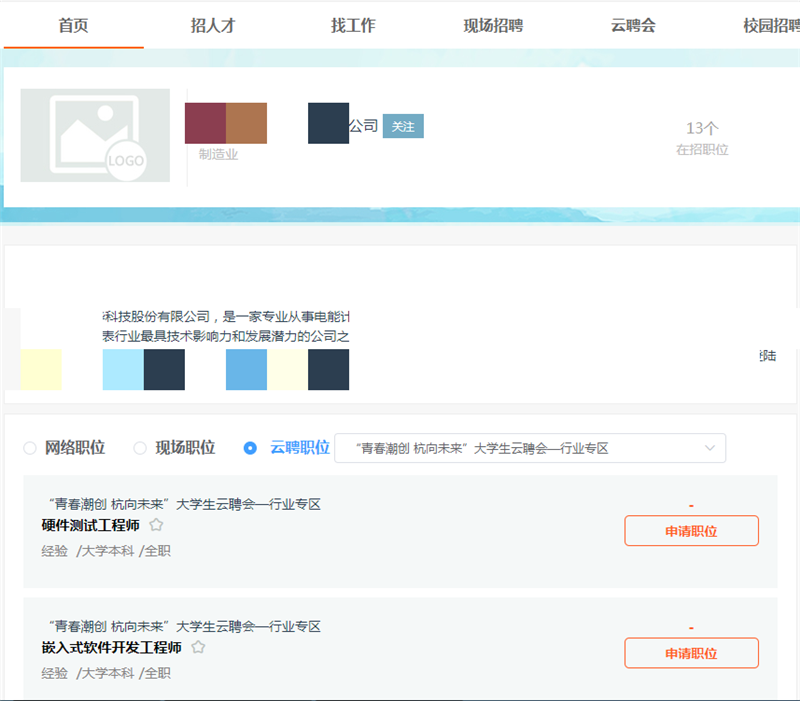 3.点击单位名称跳转至单位详细页面。在心仪的岗位右侧点击“申请职位”按钮申请该岗位。