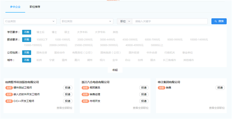 2.通过链接进入2022“青春潮创 杭向未来”大学生云聘会,在6个专区内浏览自己心仪的单位,也可使用导航栏搜索适合自己的行业和岗位。