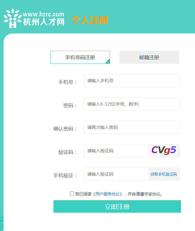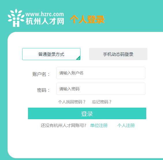 1.打开杭州人才网(www.hzrc.com)点击右上角“登录”按钮,使用个人账户名、密码,或者手机动态验证码登录杭州人才网个人账号。没有个人账号的,需要使用个人手机号码或者邮箱注册个人账号。