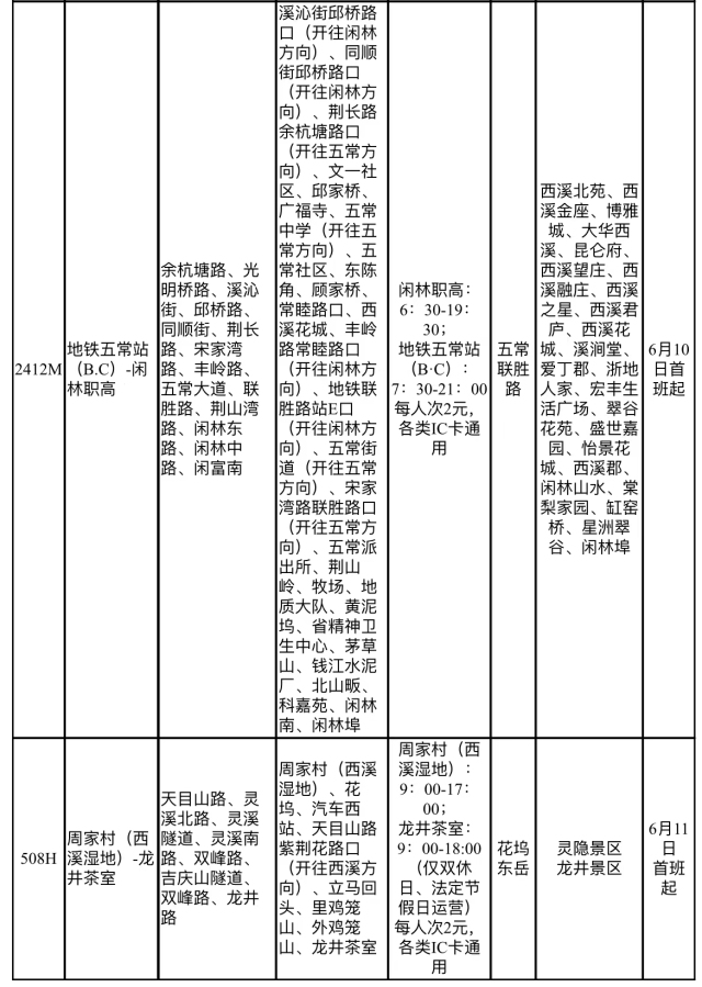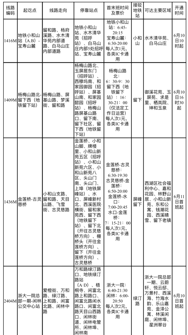 为方便市民换乘地铁,6月10日10时起,首批共计6条地铁接驳线将逐步开通(详见下表)。其余接驳线,杭州公交也将根据地铁站周边道路施工情况、站务设施建设情况等尽快开通,届时将在官方网站、微信公众号上公布。
