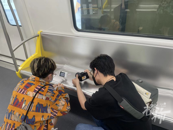 浙江科技学院的学生,今天也来3号线上拍摄照片,特别是校徽,必须在列车上露露脸。林同学今天还特地回母校来帮师弟们拍照。