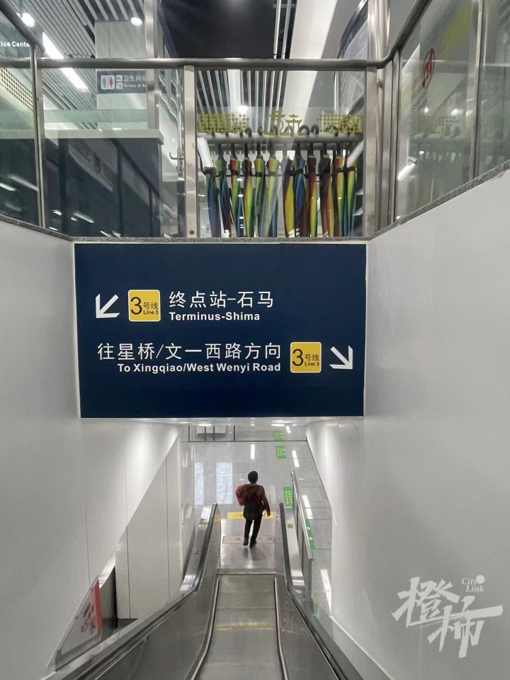 当石马、小和山方向坐3号线的乘客,如果想去文一西路怎么办呢?那就在西溪湿地南下车以后,先上楼到达站厅层,然后穿过整个大厅,在另一边下楼去另一个站台,换乘三号线主线前往文一西路方向。
