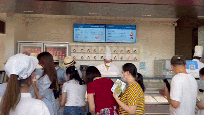 排队的,绝大部分是年轻人。买好一杯冰淇淋,拿在手中,再和门头合个影,发朋友圈,打卡规定动作一气呵成。
