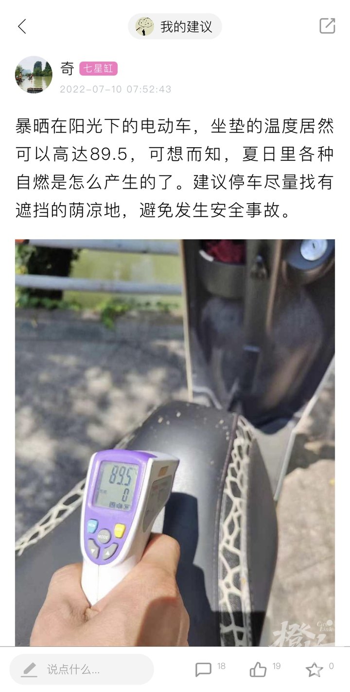 橙友“奇”用手持测温枪,测了下暴晒在阳光下的电动车,测出黑色坐垫的温度居然高达89.5℃!坐上去,真的是要烫屁股了!
