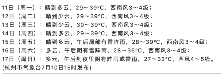 得等到下周末,16日起随着副高南落,杭州会出现大范围的阵雨雷雨天气,高温天气才有望略缓解。