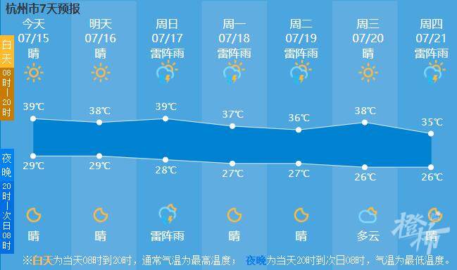 明天白天杭州最高气温39℃左右,如果云层更厚,云量更多,日照的时间再短一点,最高气温很可能低于39℃,不过哪怕是37℃,人体感觉还是很热的。