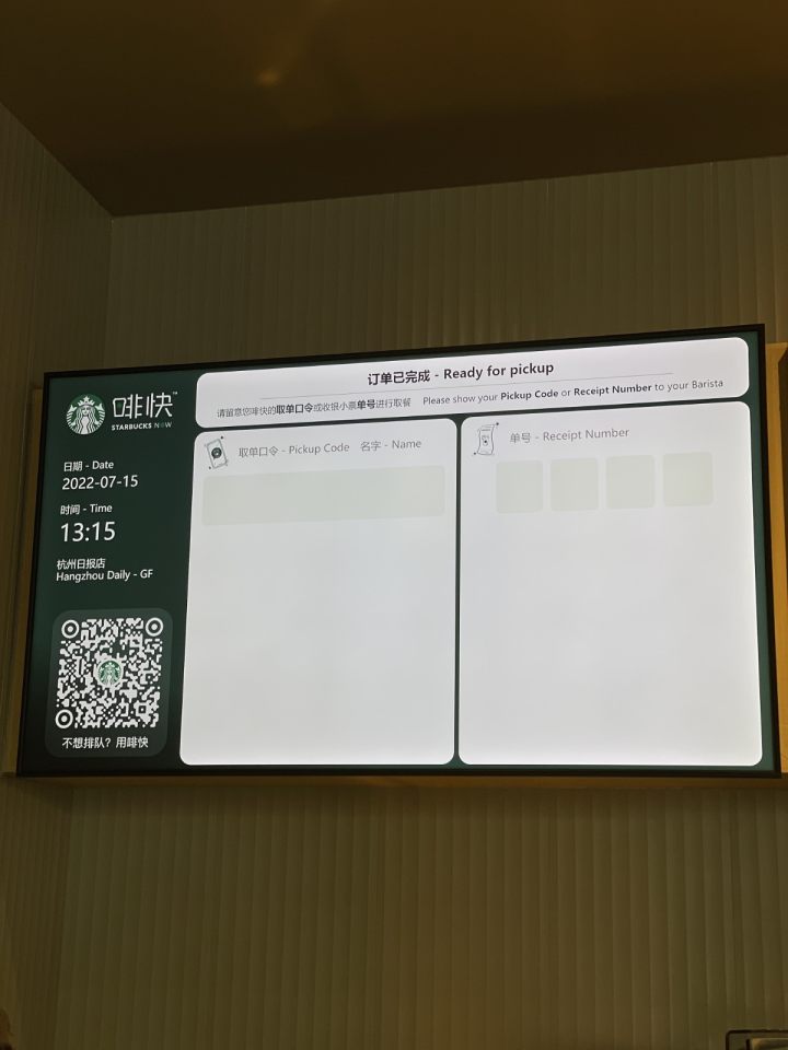 而出饮台上方的这块大屏幕,有点像医院里的叫号系统,这样顾客就能及时了解自己的订单进程。