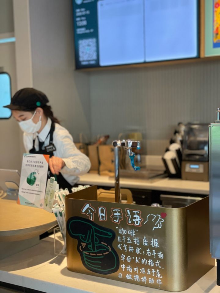在咖啡师制作咖啡的时候,我看到了这个“今日手语”,还有几个女生顾客在好奇地学习手语。我观察了一下,咖啡师的制作过程流畅,不需要花更多时间等待。跟其他星巴克的不同之处在于,点单以后没有“唱单”了,只有他们的手语交流。