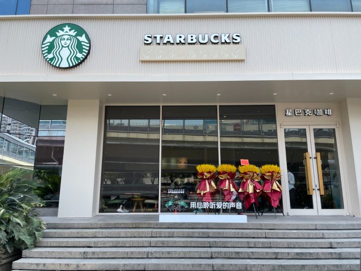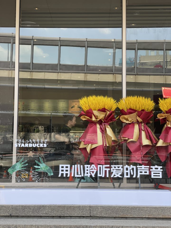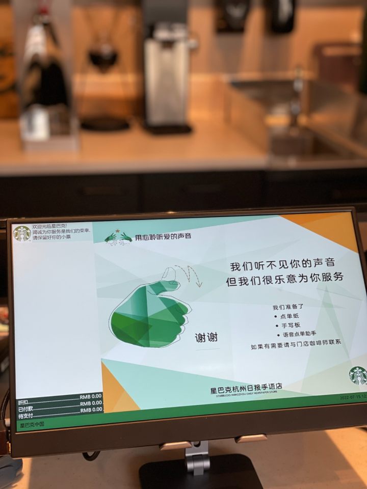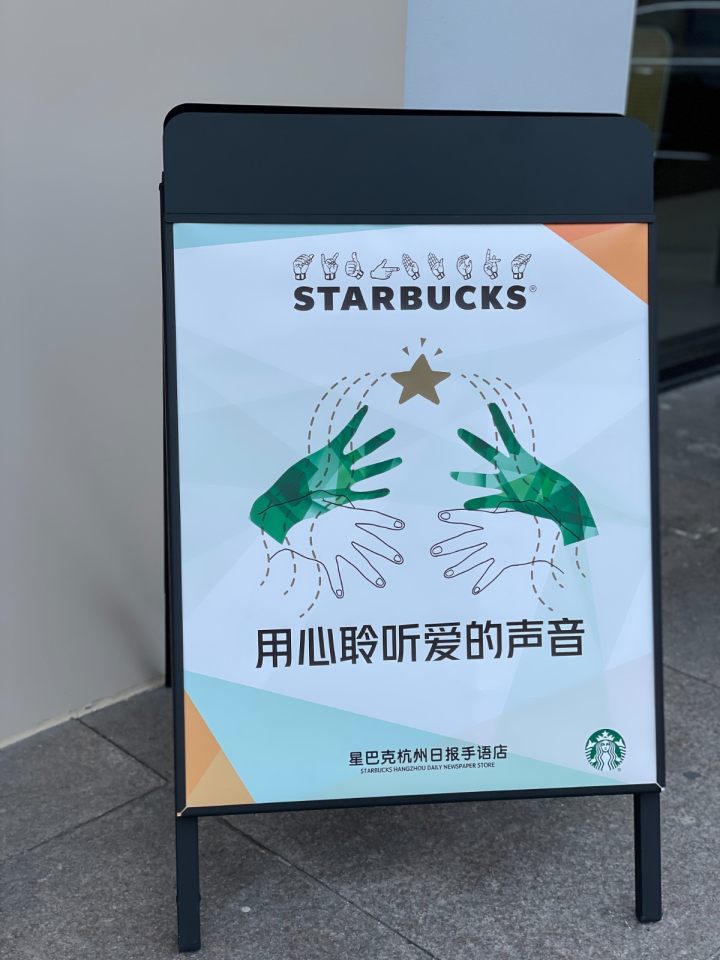 今天(7月15日),重新装修后的星巴克杭州日报店开张了,作为每天都要路过的常客,我注意到门口多了一块牌牌,上写“用心聆听爱的声音”,而且星巴克logo上还有一排图形——咦,这是星巴克的手语店吧?看到过介绍,那些图形是星巴克的手语表示呢。