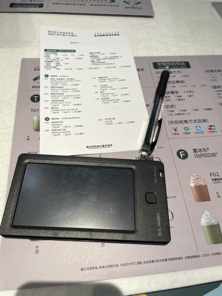 门店里的每种饮品与食品都有编号,就像进了茶餐厅,可以直接勾选,不过我觉得语音点单助手更环保,就体验了一把。如果报的咖啡名够清晰,它可以将语音同步“翻译”成文字,非常方便。