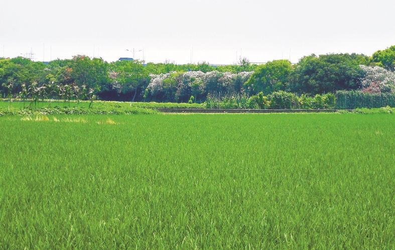 盛夏,共裕村旁,满眼的稻子和各色花木相映成趣,装点成美丽乡村的靓丽风景。