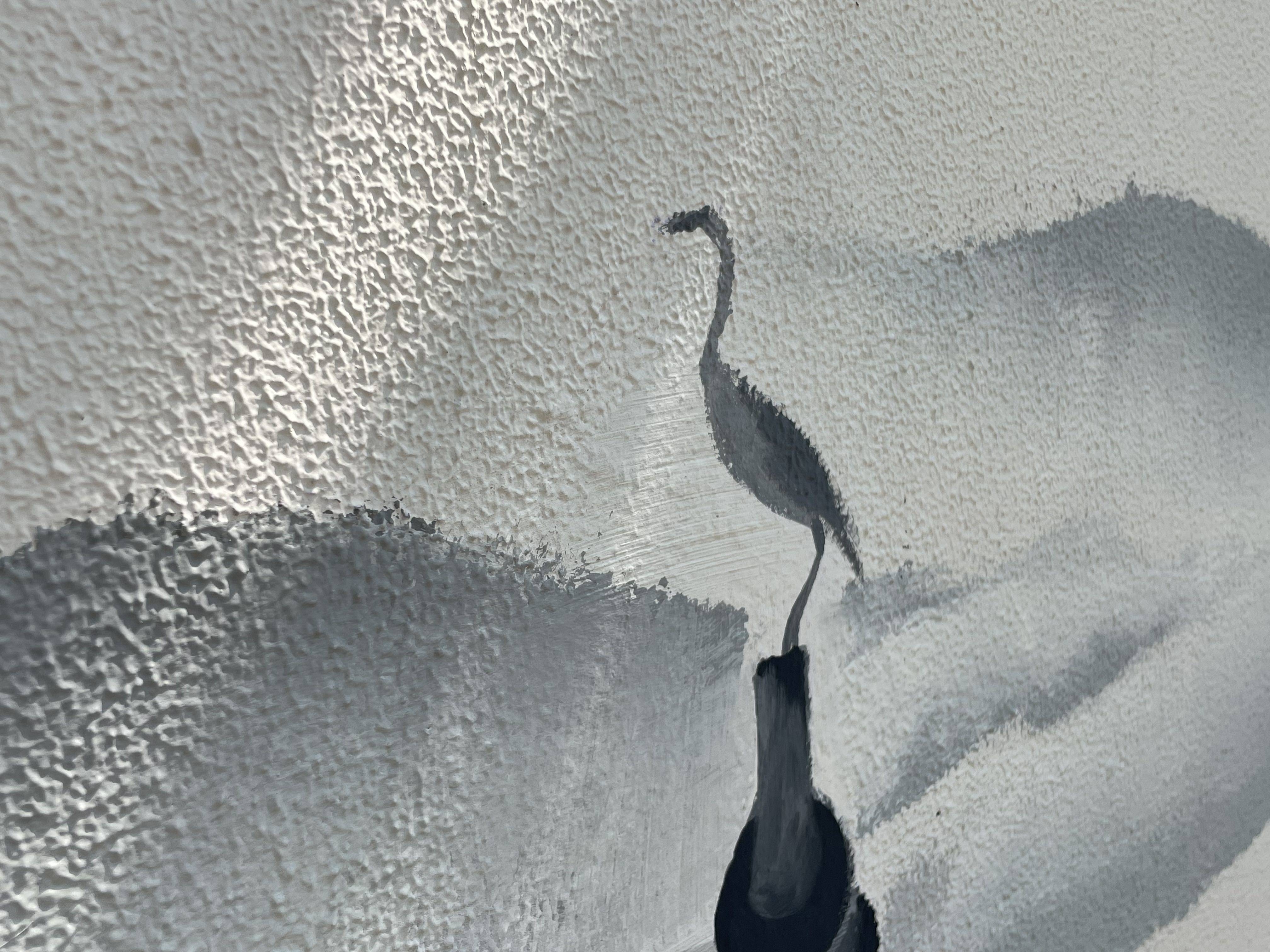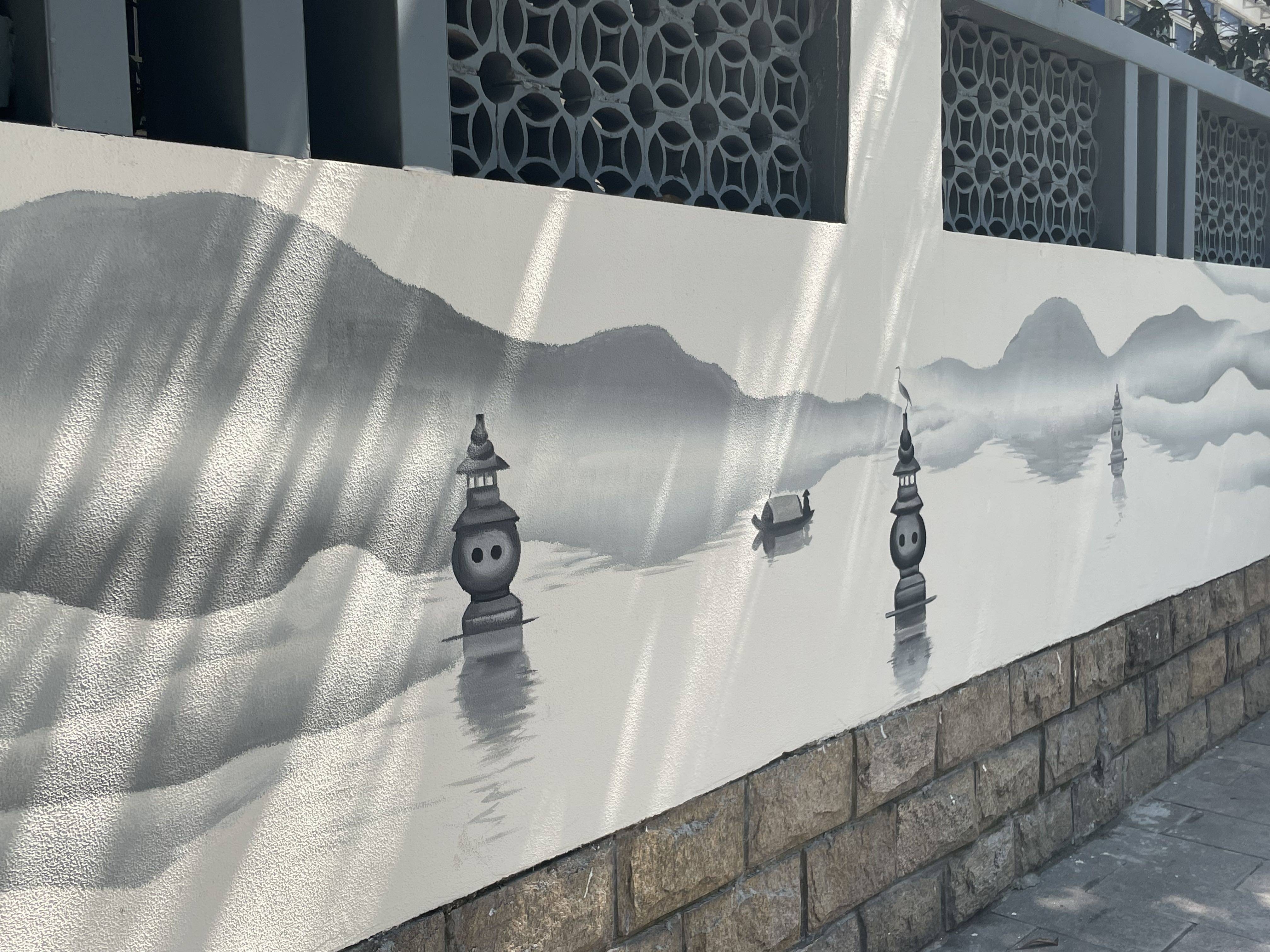 上午9点,记者来到体育场路东段、浙报宿舍楼前面。百米长的围墙,变成了一幅超长水墨画。钱江新城、大运河拱宸桥、西湖三潭印月跃然墙上。墙面上绘制了大块重叠起伏的山,远远看去深浅不一、颇有层次感。近处则画有"孤舟蓑笠翁,独钓寒江雪"之景,独脚站立在船篷上的鸟,栩栩如生。