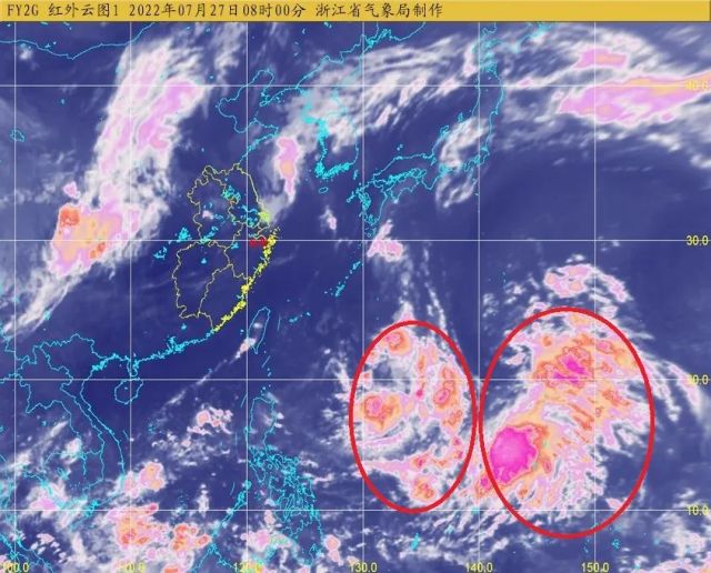 目前在菲律宾以东的太平洋上有两个明显的热带云团在活动,其中一个已经达到了热带低压的级别,相当于台风的胚胎已经形成,本周可能生成为今年的第五号台风。