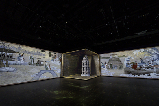 杭州国家版本馆数字馆是一个版本数字展厅,以数字版本+沉浸多媒体空间的形式展现中华版本内涵,提炼展示中华优秀传统文化精神标识的当代价值。展厅通过“裸眼3D+沉浸式光影”方式,虚拟化玉琮王、五代雷峰塔经卷、元龙泉窑青瓷舟形砚滴、龙井茶证明商标、共产党宣言等浙江特色版本珍品。