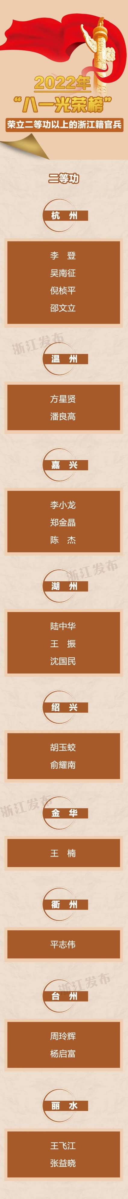 值此中国人民解放军建军95周年之际,推出“八一光荣榜”,公布2021年4月1日至2022年3月31日期间荣立二等功以上的浙江籍官兵。