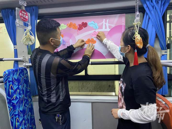 今年七夕,这辆亲亲巴士车厢内增添了许愿墙,并准备了爱心形状的便签纸,方便大家书写爱情告白,一句句情意绵绵的寄语,营造了浪漫的七夕氛围,车厢扶手上挂满了寄托爱慕之情的刺绣荷包,在荷包内写上爱的表白后送给另一半。