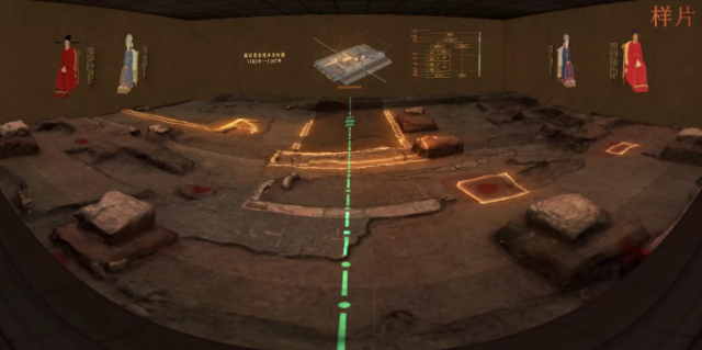 作为重华殿正殿遗址所在之处,在中区遗址的设计动线上能看到三块巨型幕布,将遗址北、东、西三面包围住。这里将打造成一个沉浸式CAVE影像播放空间。“通过视觉融合技术,四面成像的CAVE空间(虚拟现实)将复原影像和宫廷生活以裸眼3D的效果给观众带来身临其境的视觉效果。”团队项目负责人说。