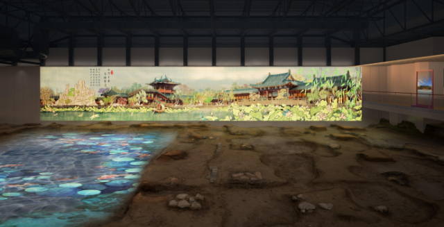 3500余平方米的空间里,共设置了10处数字化“打卡点”。比如遗址南部,一池碧水从西边的中河蜿蜒而来。眼前的流水潺潺,是采用了投影灯和水纹灯结合方式,将影像直接投射在水池水渠遗址之上。而在水池遗址西侧,透过一面AR透明屏 ,观展者能看到复原的池边茶阁游园画面。