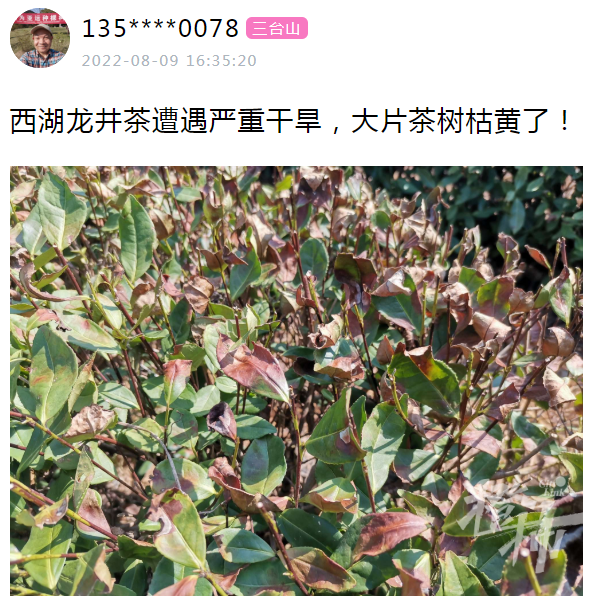 有橙友135****0078发帖说,在龙井村里,看到西湖龙井茶遭遇严重干旱,大片茶树枯黄了。