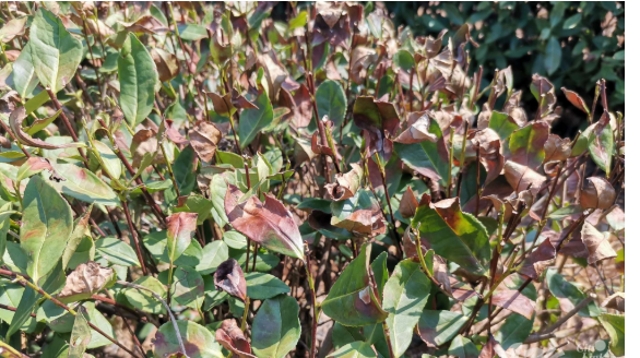 旱热害是旱害和热害相伴发生,茶树因长时间遭遇高温、干旱和强光照射后出现的叶片变色、焦枯、脱落、枝条干枯甚至整株死亡的现象。