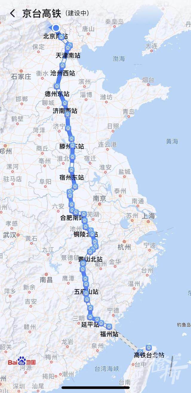 手机上打开地图软件,搜索“京台高铁”就能看到,它北起首都北京,一路向南经过天津、河北、山东、安徽、江西、福建,跨过台湾海峡到台湾。