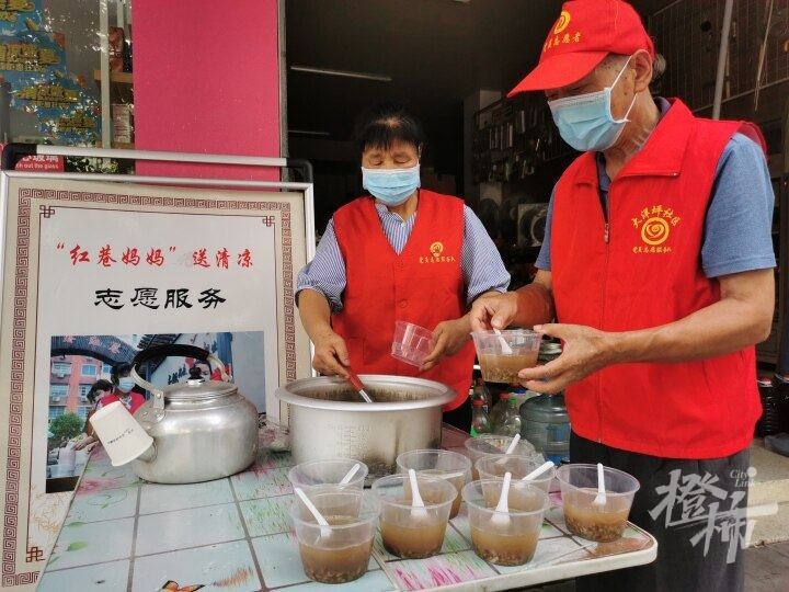 在桐君街道南门社区,夏季的凉茶摊是社区家喻户晓的公益服务项目。每年的7月1日至9月30日,社区志愿者都会在老年食堂门口摆起凉茶摊,免费供应凉茶及解暑饮品。