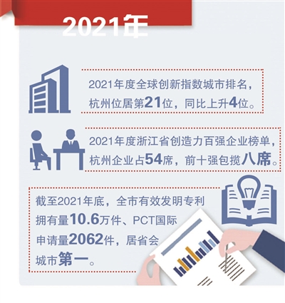 近年来,杭州打通知识产权创造、运用、保护、管理和服务全链条,护航知识产权高质量发展。世界知识产权组织发布2021年度全球创新指数城市排名,杭州位居第21位,同比上升4位。根据省市场监管局通报,杭州在省委、省政府对设区市2021年知识产权保护工作考核中位居全省第一。浙江省知识产权研究协会发布2021年度浙江省创造力百强企业榜单,杭州企业占54席,前十强包揽八席。