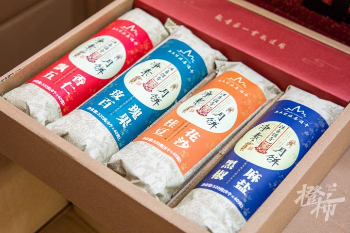 香积寺的月饼用的是进口橄榄油制作,一共五个口味,百果、莲蓉、椒盐、黑麻和玫瑰。规格分为筒装的,每筒8个,一筒一个口味;精装礼盒的,每盒8个月饼,每种口味都有。