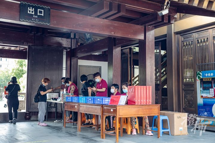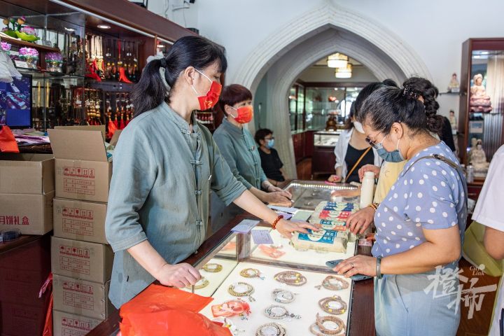 因为今天是佛教盂兰盆节,寺庙全天免费开放,入寺祈福的人很多,但临走前,大家都会想着要带点素月饼回去。