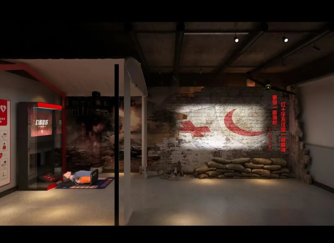 该展厅将战地医院实景和数字多媒体交互技术、急救技能辅助训练系统结合,建设急救技能训练体验馆,弘扬扶危济困、救死扶伤的红十字战地救护精神,方便群众利用碎片化时间自助学习急救技能。